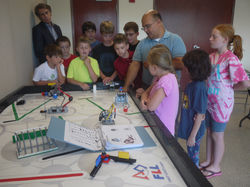 ![]() Students program their robots in Robotics II | ![]() Walt Silva explains the individual challenges on last year's FIRST LEGO League mat |